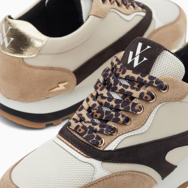 REF : BK2703BG- Baskets en nylon beige clair- Garant, empiècement avant et contrefort en suédine beige- Empiècement en suédine marron foncé- Empeigne et languette en mesh blanc- Empiècement en forme de vague en similicuir blanc- Patch arrière en similicuir texturé or- Fermeture à lacets beiges imprimé léopard- Bout rond- Semelle bicolore peinte en blanc et noir à petits crampons camelHauteur du talon : 3 cmHauteur de la plateforme : 2 cmHauteur de la tige : 8 cm Ce modèle taille normalement, prenez votre pointure habituelle. Pour les demi-pointures, préférez la taille du dessus.Vanessa Wu1DEM302DEM30AHAH24AH24-DROP 2Black FridayDernières piècesLast itemsSoldesVANESSAWUXTB0225
