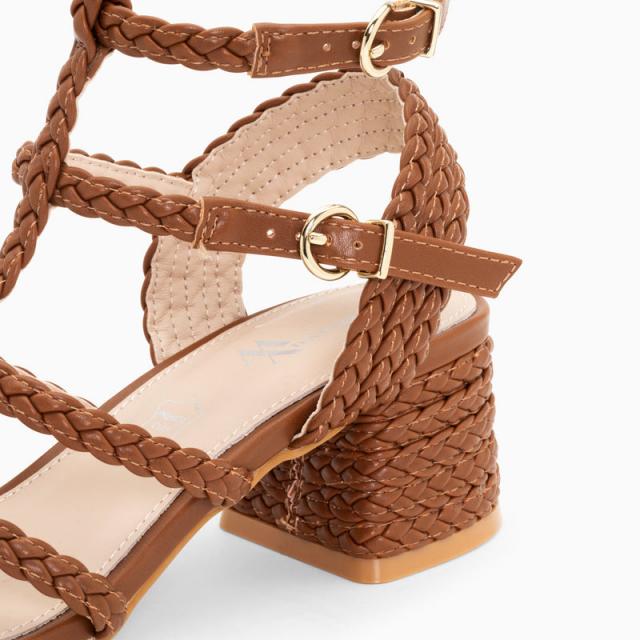 REF : SD2081CM – Sandales à talon en similicuir camel – Brides tressées – Deux brides de cheville réglables – Fermetures à boucles dorées – Talon bloc Hauteur du talon : 5,5 cm Hauteur de la plateforme : 0,5 cm Ce modèle taille normalement, prenez votre pointure habituelle. Pour les demi-pointures, préférez la taille du dessous.Vanessa WuPEPE23Point JauneYellow dot
